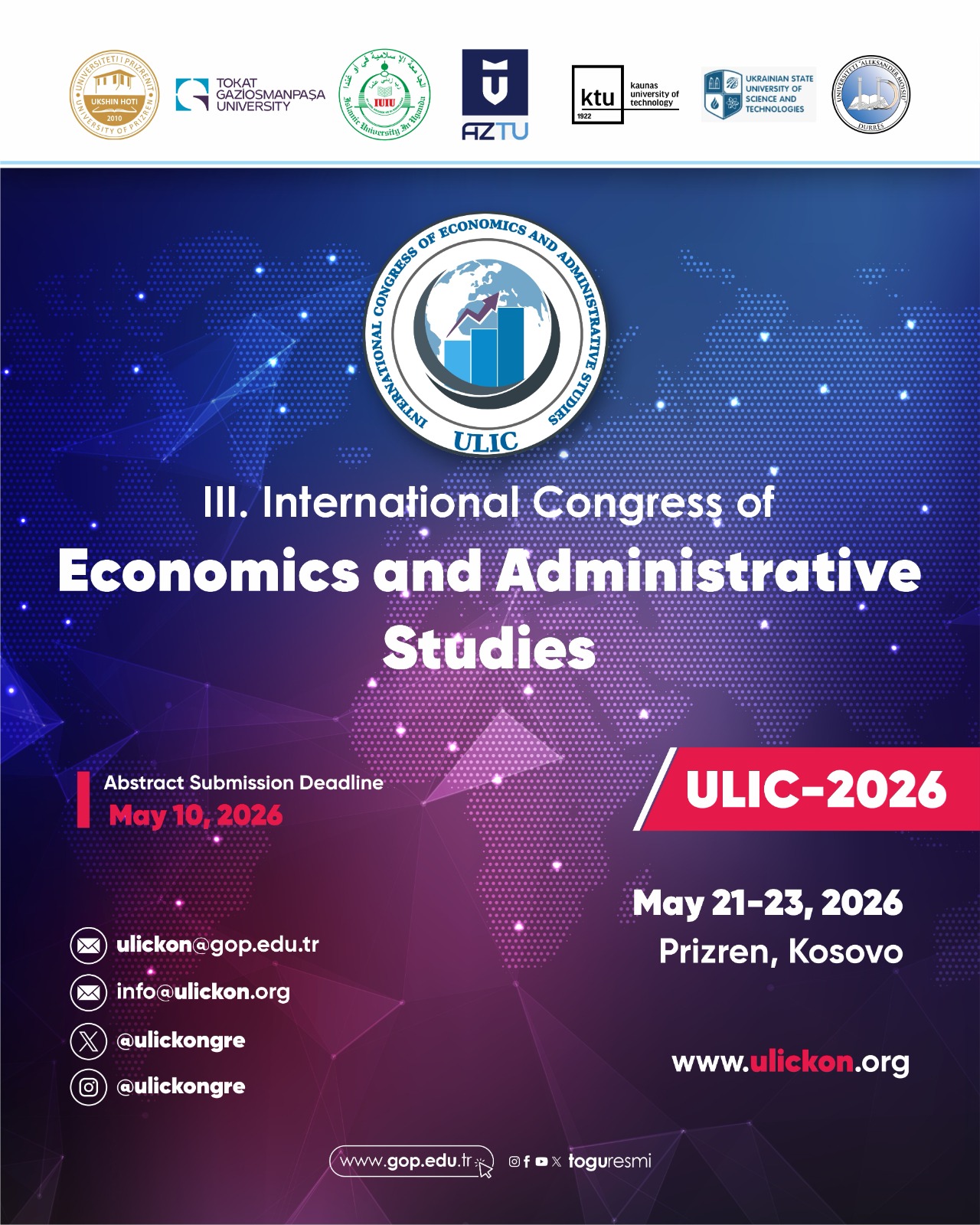 The 3rd International Congress on Economic and Administrative Studies will be held on 21–23 May 2026 in Prizren (Kosovo), hosted by the Faculty of Economics at “Ukshin Hoti” University of Prizren, in collaboration with Tokat Gaziosmanpaşa University Faculty of Economics and Administrative Sciences, Islamic University in Uganda, Azerbaijan Technical University, Ukrainian State University of Science and Technology, School of Economics and Business of KTU and University "Aleksandër Moisiu" Durrës. The congress will take place in a hybrid format (online and in-person). In its third iteration, the congress will accept academic submissions from all fields of economics and administrative sciences, including banking and finance, labor economics and industrial relations, econometrics, economics, statistics, business administration, public administration, finance, and political science and international relations.