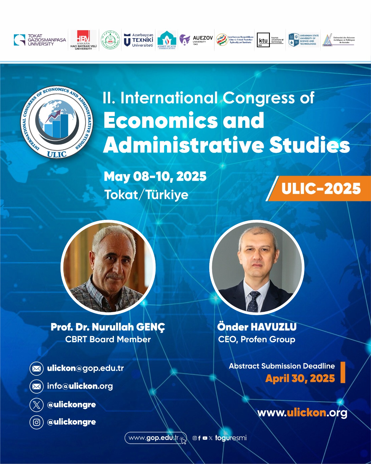 The 2nd International Congress of Economic and Administrative Studies (ULIC), organized by the Faculty of Economics and Administrative Sciences of our University, commenced with an opening ceremony held at the July 15th Congress and Culture Center. The ceremony was attended by our Rector, Prof. Dr. Fatih YILMAZ, former Minister of State Metin GÜRDERE, Secretary General of the Tokat Special Provincial Administration Ahmet KAYHAN, Deputy Mayor Haydar ALPAT, Vice-Rectors, the Secretary General, Rector's Advisors, department heads, representatives of NGOs, academic and administrative staff, and a large number of students.